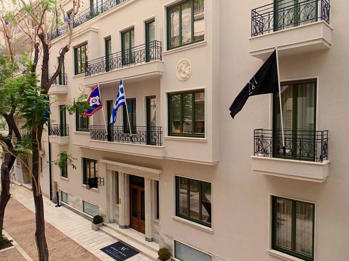 We got wind of this one from a Greek friend who recently defected to the hotel project that’s rising above this place, and it’s hidden in plain view: I’m talking about the Athens Capital Suites - MGallery Collection which is a new adjunct to the nearby Athens Capital Hotel. Say they, this is “a modernist haven of luxury accommodation where light dances through time. Within our landmark 1939 building, 19 luxury rooms and suites blend graceful lines of interwar architecture with contemporary refinement.” That’s pretty accurate. While we haven’t been inside, we have inspected the façade from narrow Zalokosta Street, which is a haven of calm tucked between the roar of Syntagma and the bustle of Kolonaki. Ask about access to the rooftop pool at the larger Athens Capital Hotel around the corner.