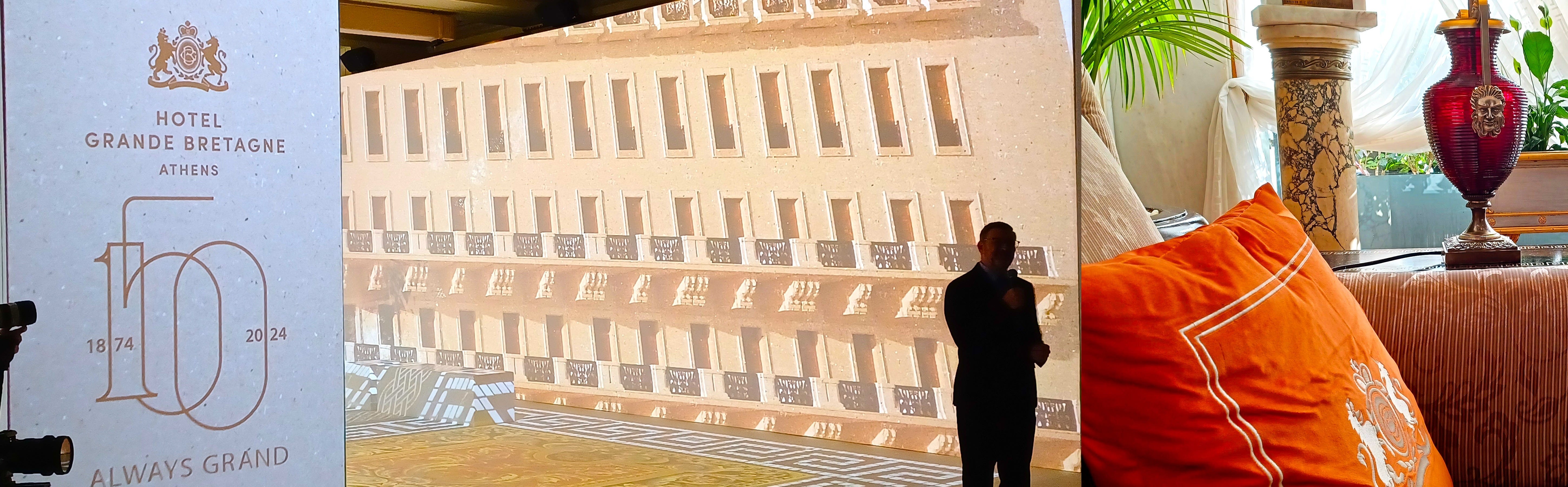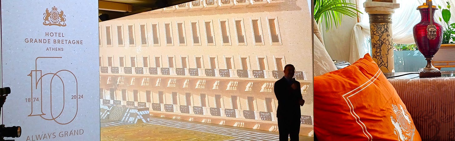 This week the Hotel Grande Bretagne put on a remarkable immersive audio-visual journey through its 150 years of history in its royal ballroom. Attendees, who included diplomats, business leaders, and your humble chief Greek Columnist, were treated to a vivid multimedia spectacle that highlighted the rich history of this hotel, which is intertwined with the history of contemporary Athens.