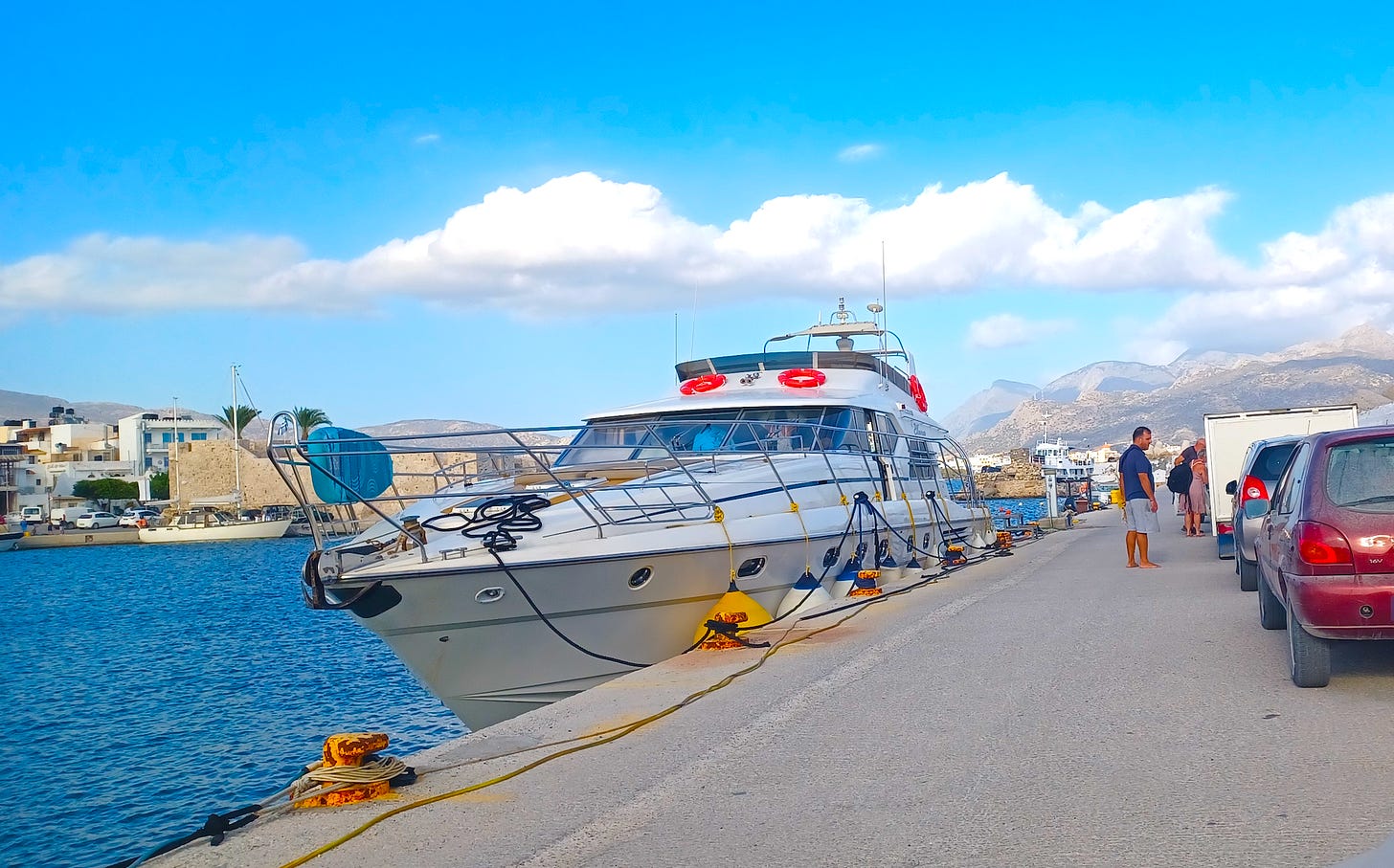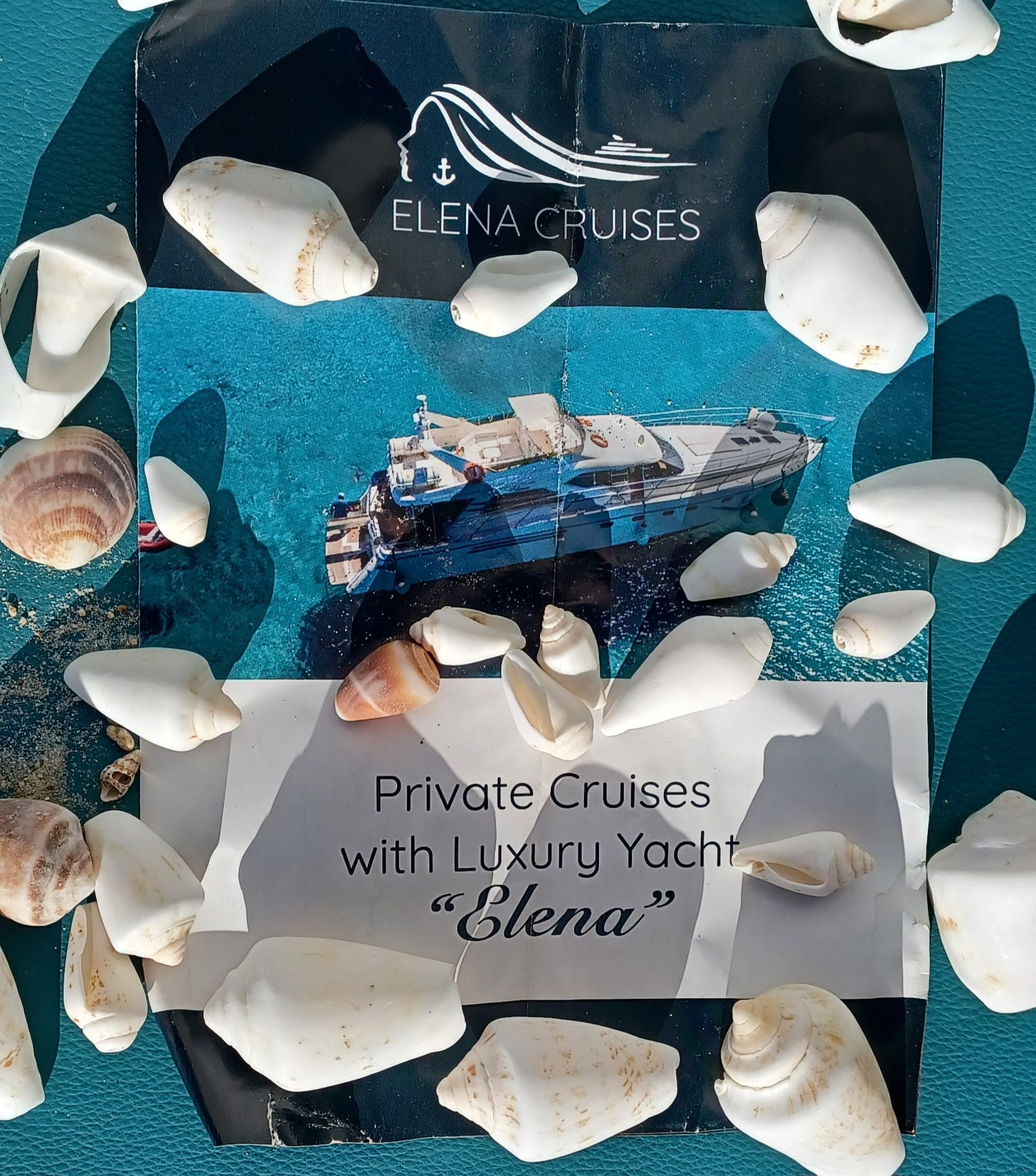 The sleek white motor yacht Elena is a luxury, British-built Princess 65 with a 200hp engine and speeds up to 35 nautical miles per hour. With a length of 65 feet and weight of over 99,000 pounds, she’s not only a beauty, but the also the biggest private boat we’ve found that makes excursions to Chryssi.