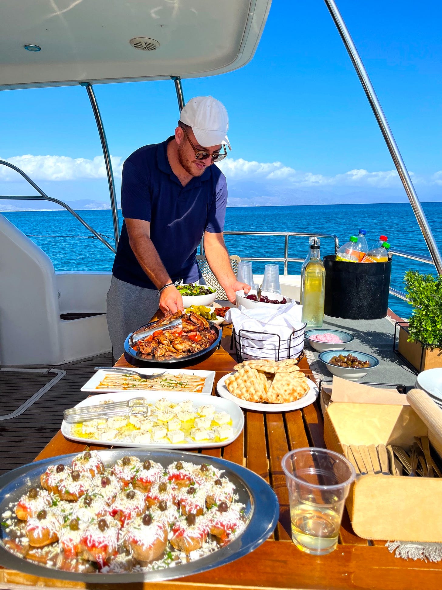 Once the conditions are right and you do set off with the Elena, it’s really all good. We weren’t able to drop anchor in the most renowned part of Chryssi’s lagoon due to wind, but since you aren’t allowed to go to the beach there until further notice (ecological healing still in progress), it didn’t really matter — we just zipped around the corner. Once moored, those who wanted to jumped into little inflatable dinghies that took us to the shore for an hour or so of swimming in the cool crystal clear water. Back on board the main boat, a freshly prepared al fresco lunch awaited. Cue the bouzouki music and platters of Greek barbecue, Cretan dakos, Greek salad, wine and more.