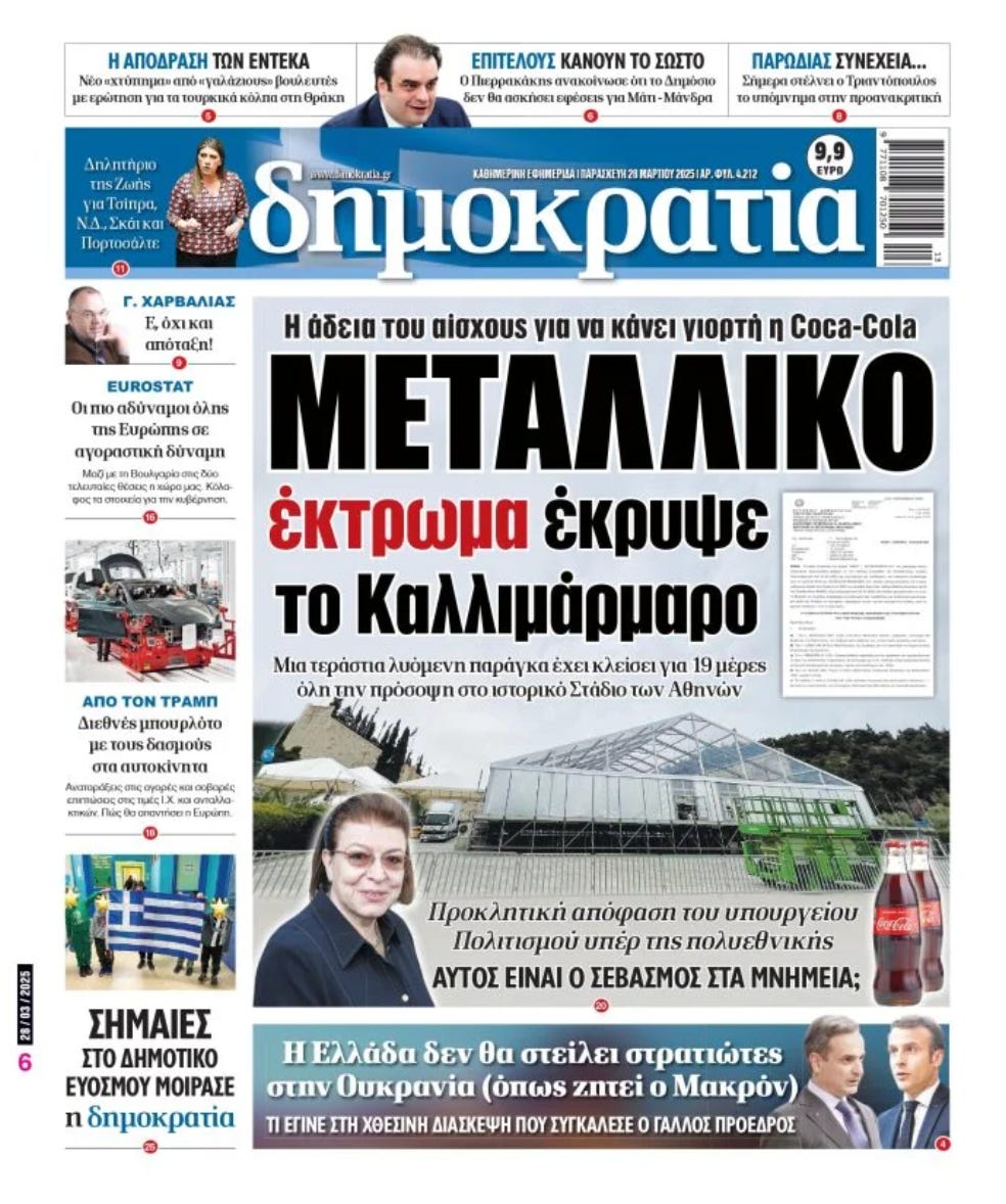 This comes after Dimokratia (pictured above) reported on the story and the ensuing uproar, in which Ms. Medoni intervened to block what that newspaper called “the makeshift construction-abscess that has been installed in front of Kallimarmaros, ‘swallowing’ the entire stadium and cutting off the magnificent view to passers-by, but also to tourists who would like to admire — but cannot — one of the most emblematic monuments of world heritage.”