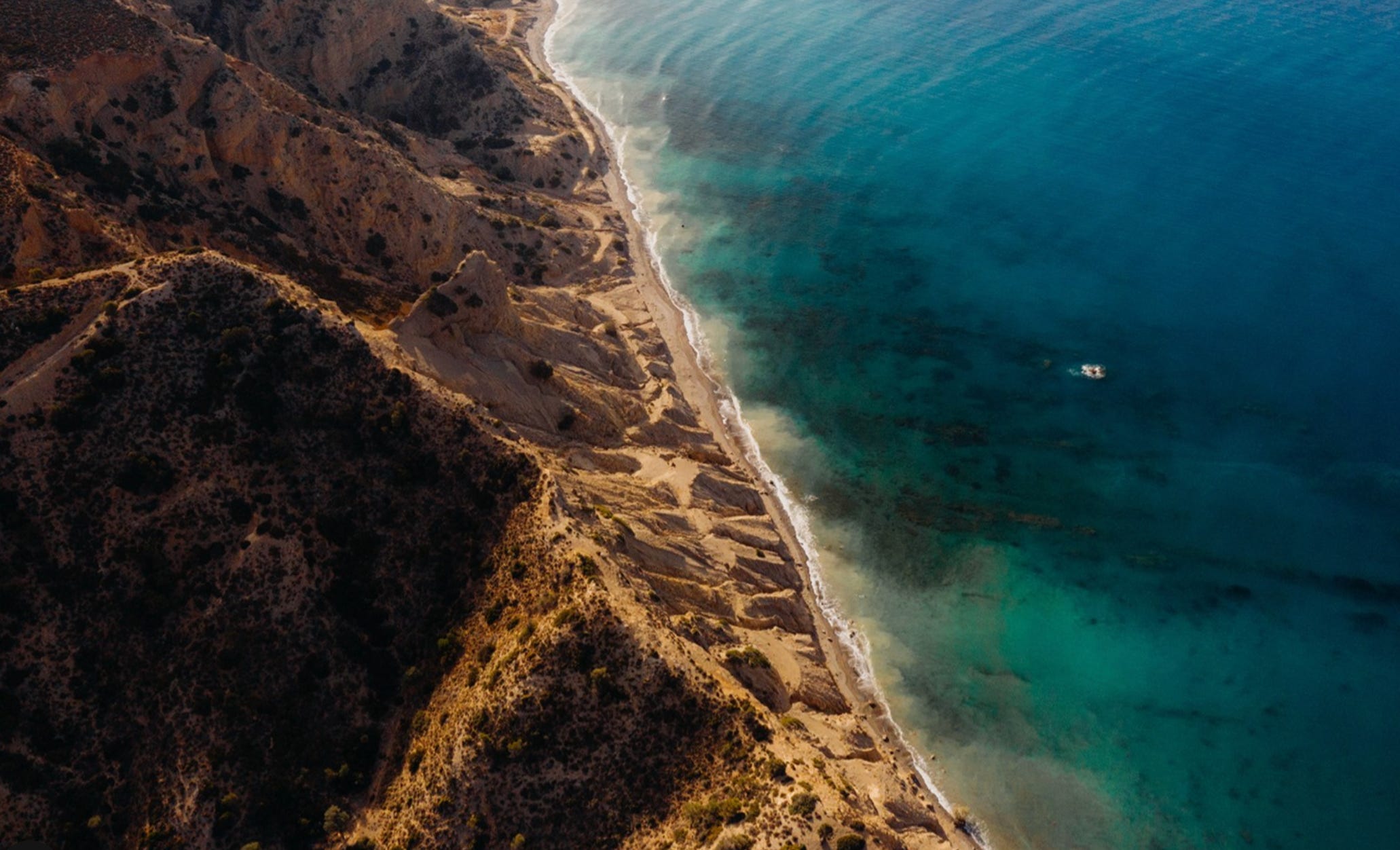 Between Matala and the farm market town of Tymbaki, which ships out watermelons and more to mainland Greece and, from there, the world, there is a very long beach called Komos that on one spot includes seaside ruins said to be part of the port of ancient Phaistos. The bay opposite is that of Messara, so wide in scale that it is reminiscent of the kind of geography you would expect in some desolate South American or African location, not Europe. Here is where, on any given morning, the silence could be punctuated by the rumble of F-16 jets, which run practice maneuvers from their base at Souda Bay, the naval base of the Hellenic Navy and NATO on the island’s north coast.