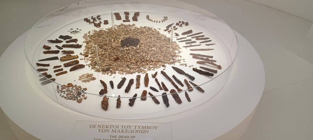 How violently they fell — and many Macedonians, too. Through the end of March a somewhat eerie display of the burial practices of the two opposing armies are on view: remnants from the Polyandrion, or mass grave, of the 254 Theban members of the sacred band, as well as the tumulus of the Macedonians.