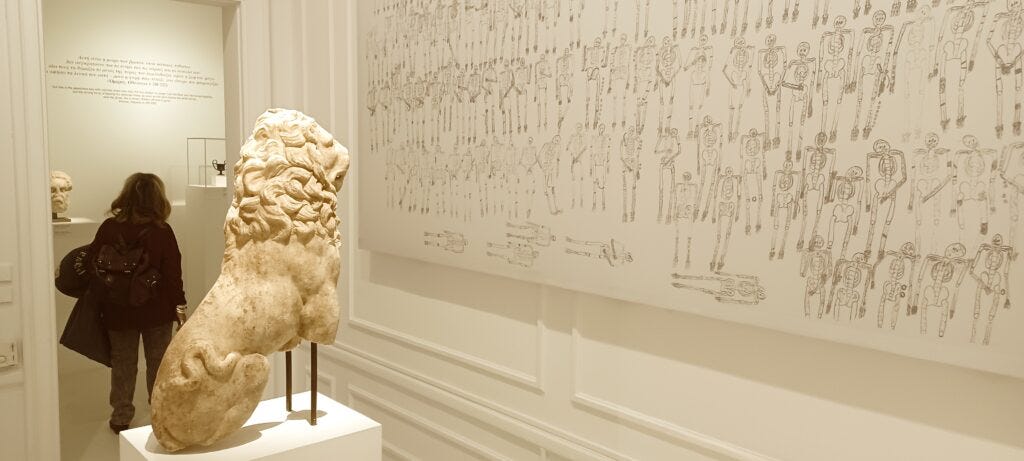 What if it had not? The question is too big to ponder, especially on such a polluted winter’s day as the Friday I went to visit the show, first entering the museum through the wrong entrance before realizing the exhibit is mainly in the museum’s Stathatos Mansion, a fanciful neoclassical villa built in 1895 by architect Ernst Ziller.