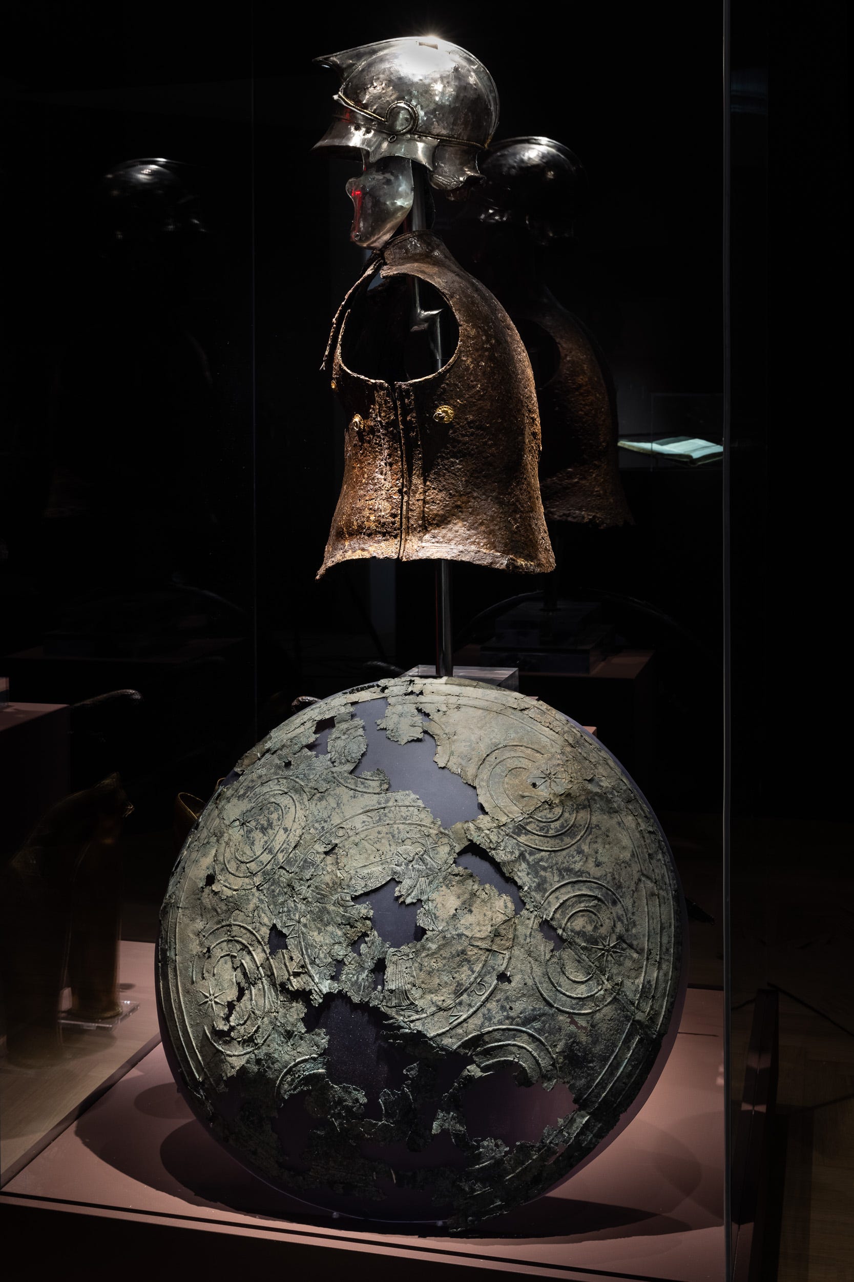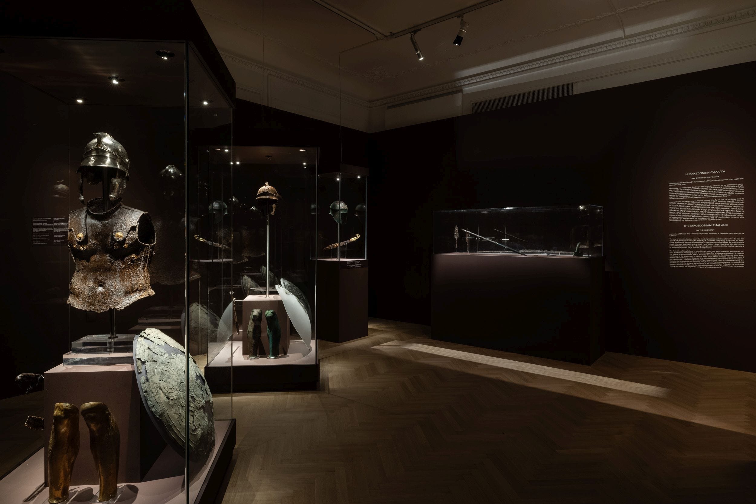 Now, gleaming with ancient ferociousness behind a glass case, bronze arrowheads and lead sling shots can be seen with the inscriptions “of King Philip.” Inside another there is a Macedonian spear still sheathed with gold filigree. Intact bronze helmets, a coat of armor, and a pair of meticulously decorated ancient shields impart a sense of the noble to the whole, essentially brutish, affair.